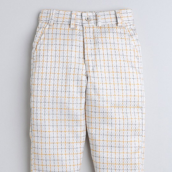 Beige and yellow checked trousers, has a button and zip closure, 2 pockets
