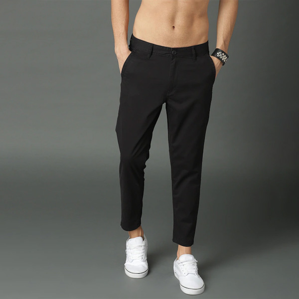 Black solid mid-rise regular trousers, has a zip closure, five pockets